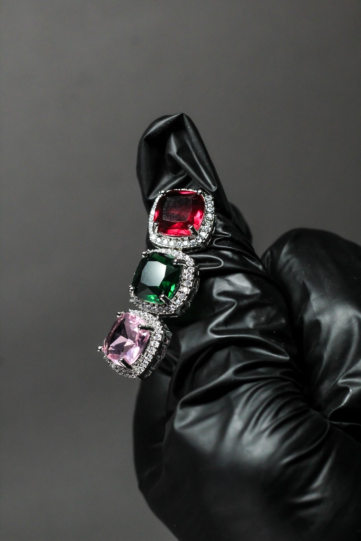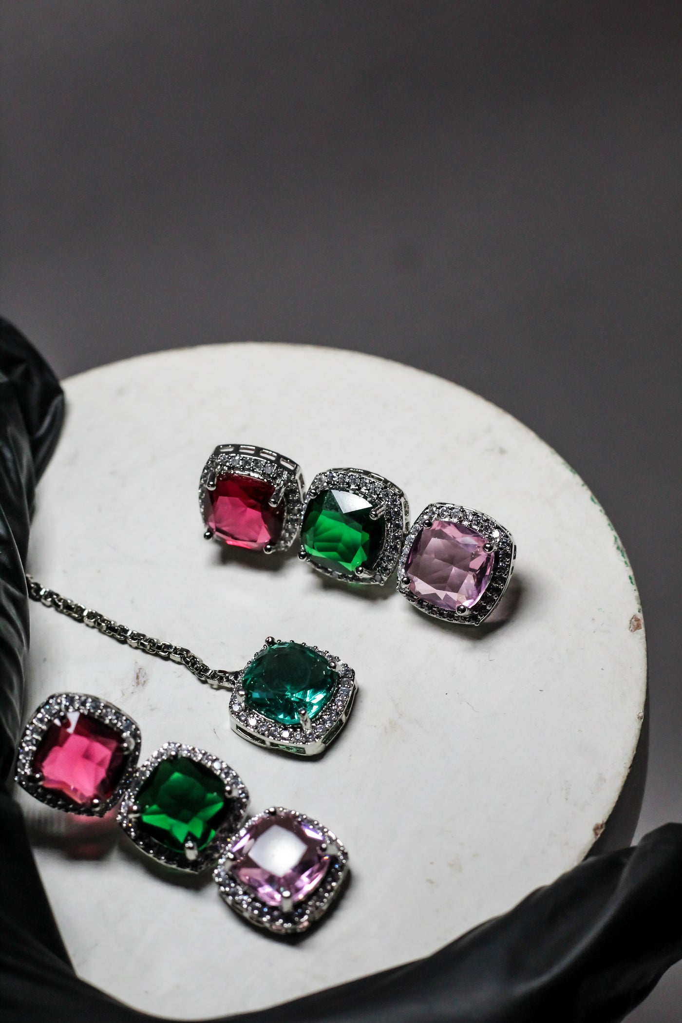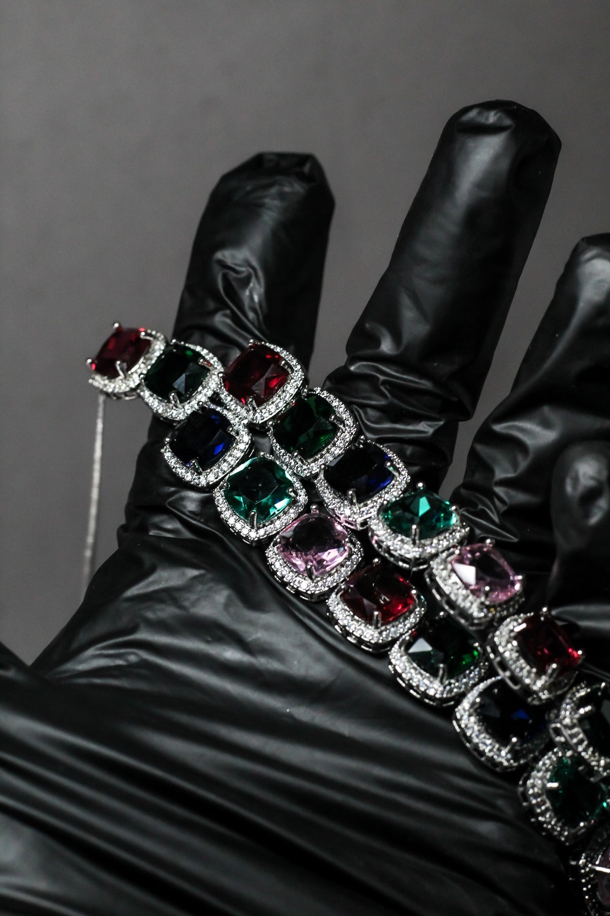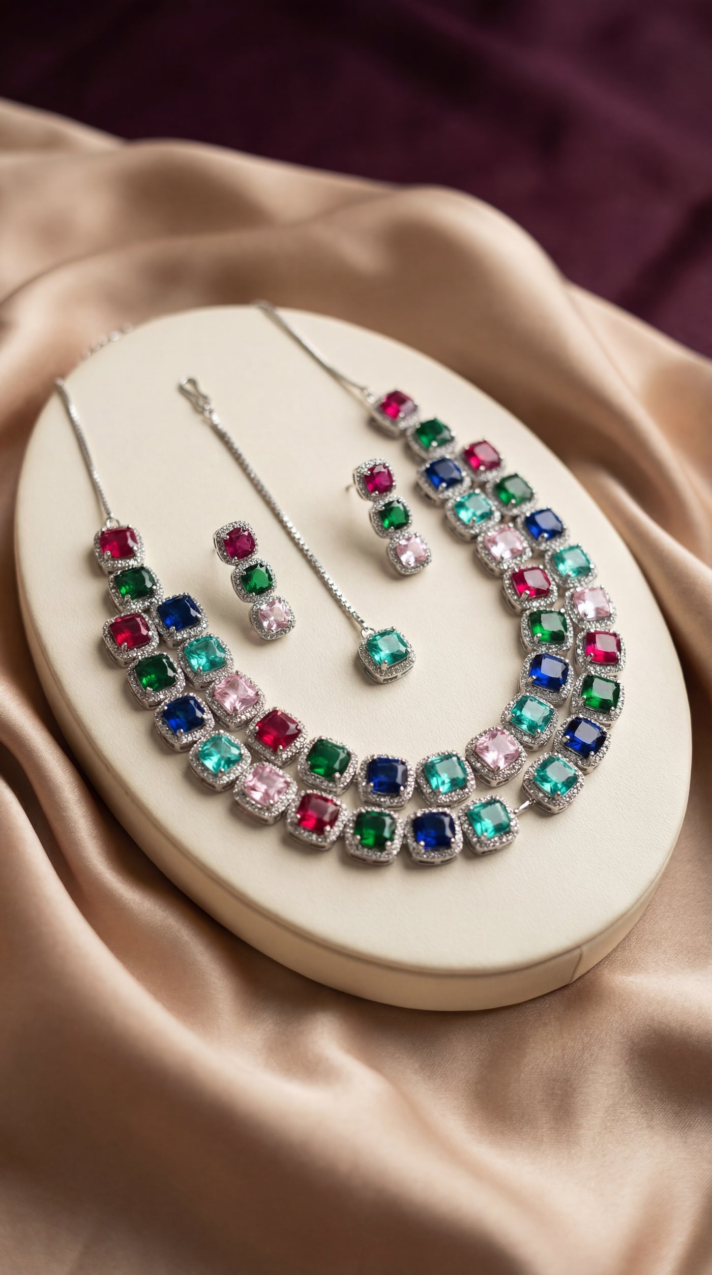 • Multicolor gemstones create a bold yet harmonious statement look.