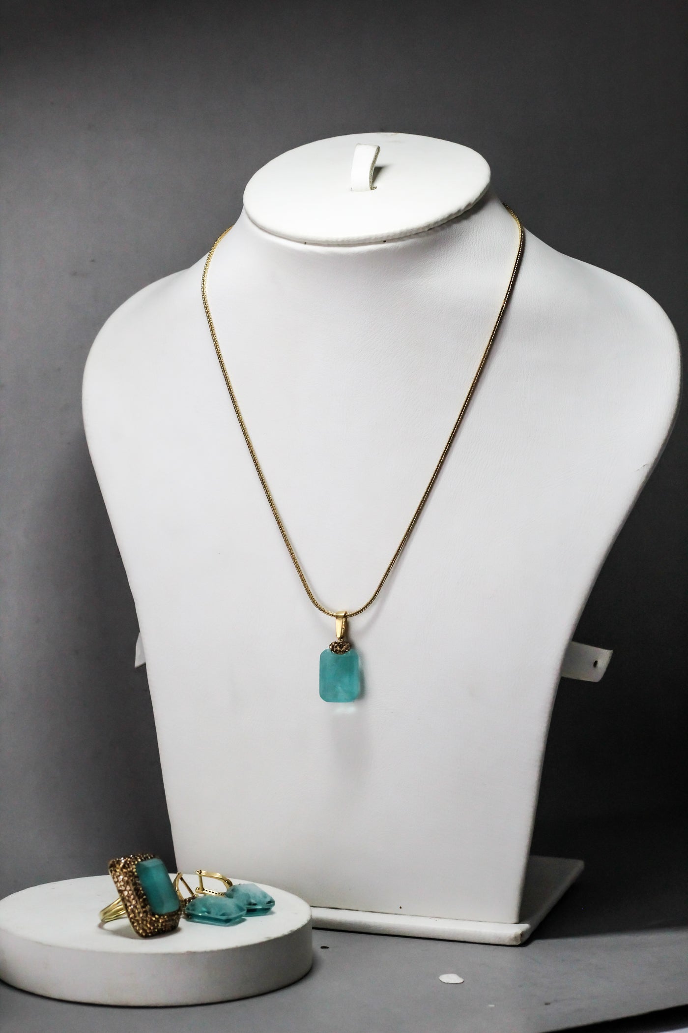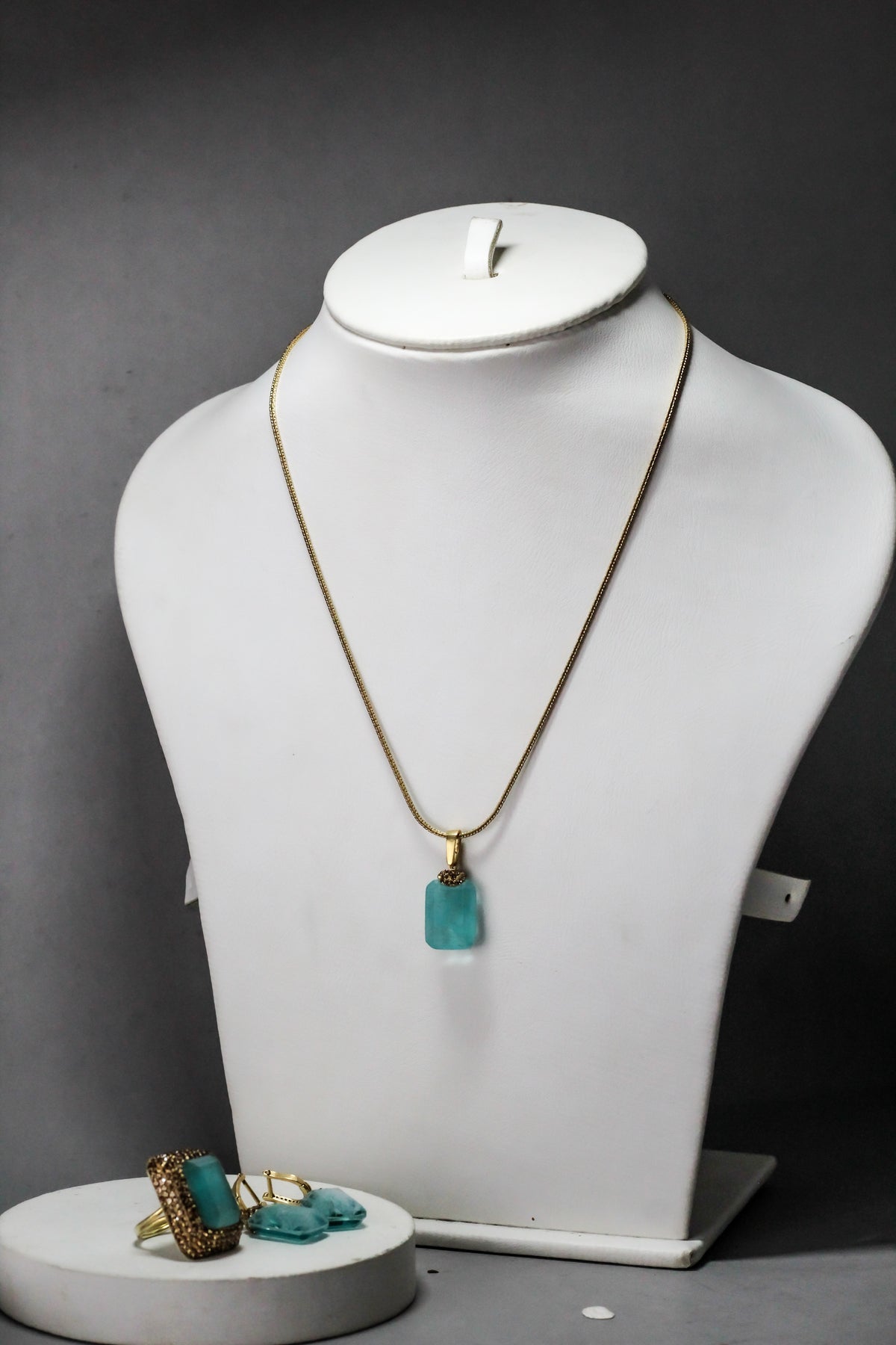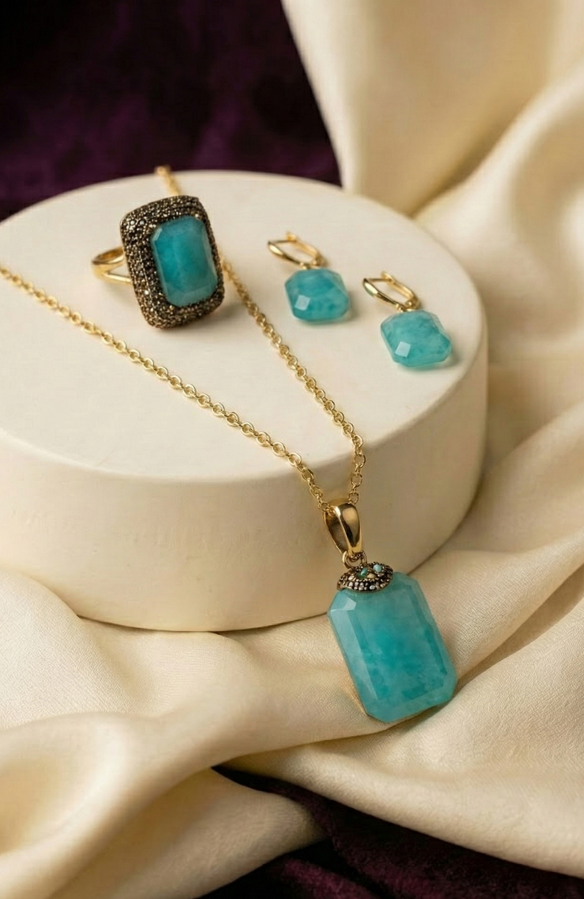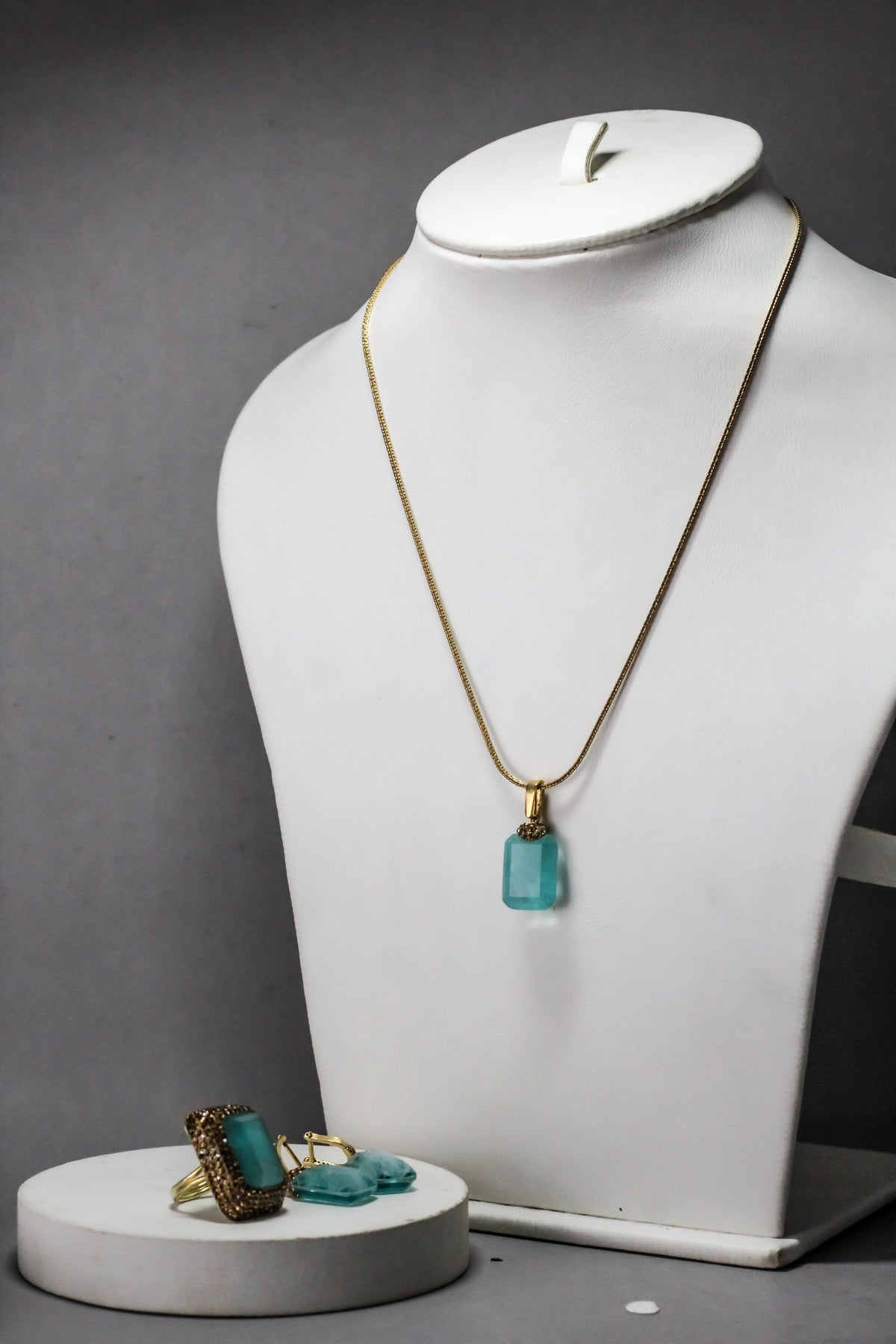 Matching necklace, ring, and earrings create a perfectly coordinated set.