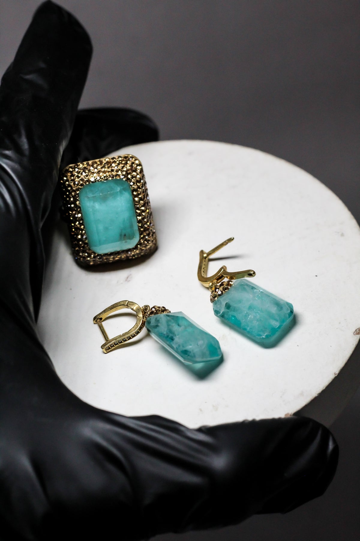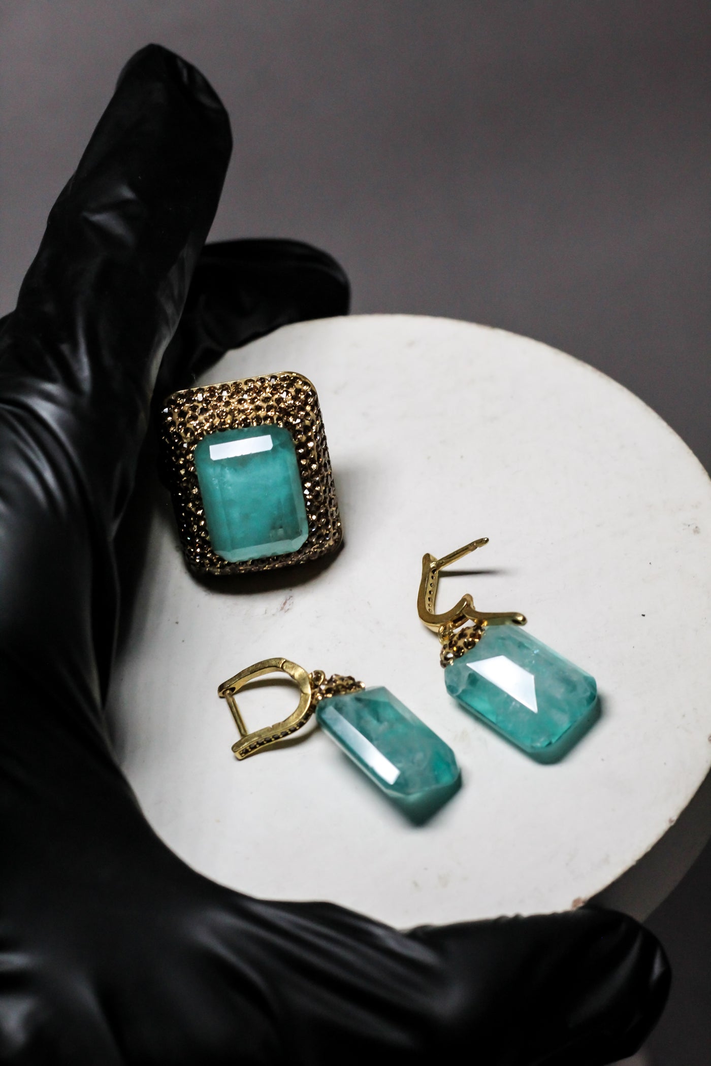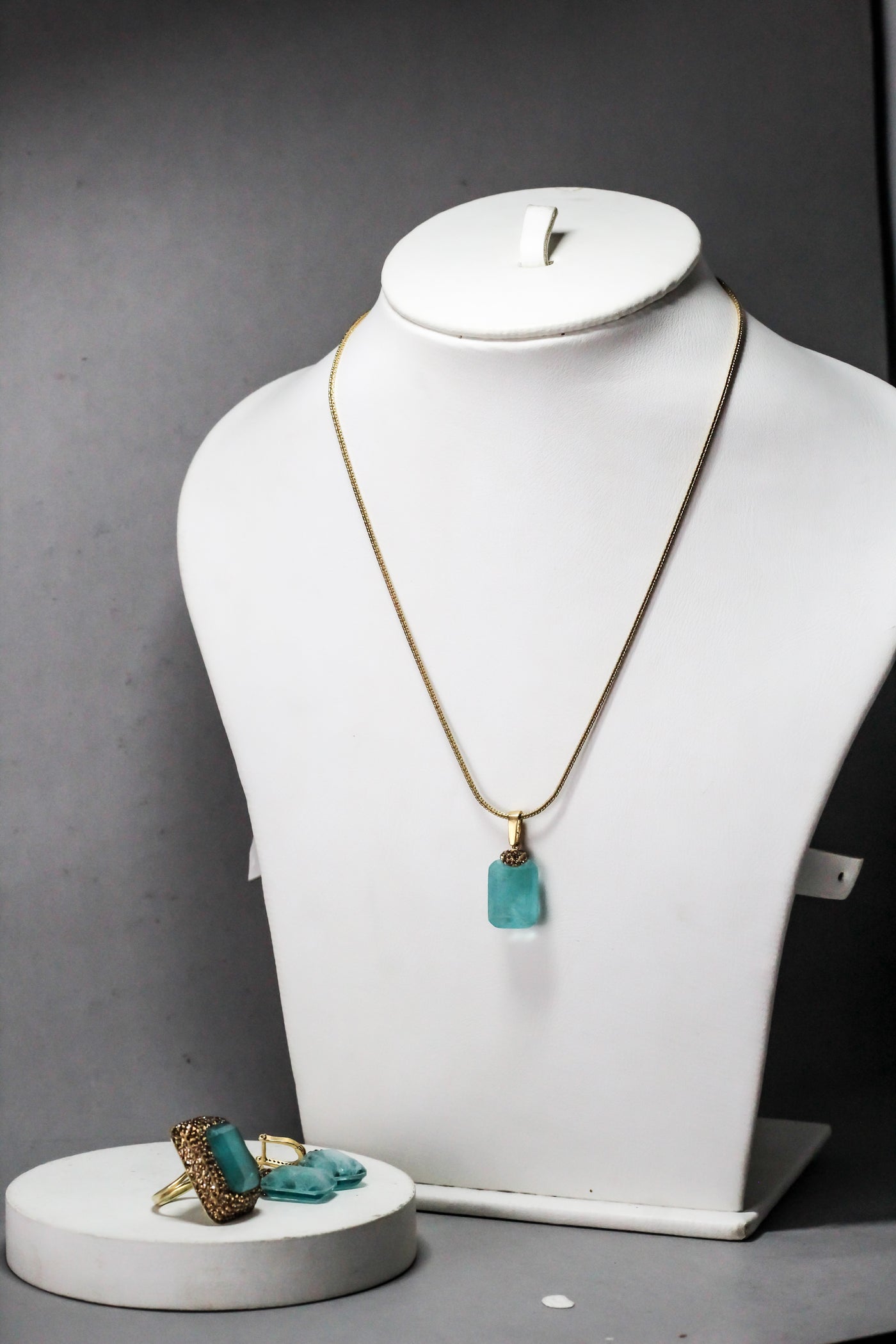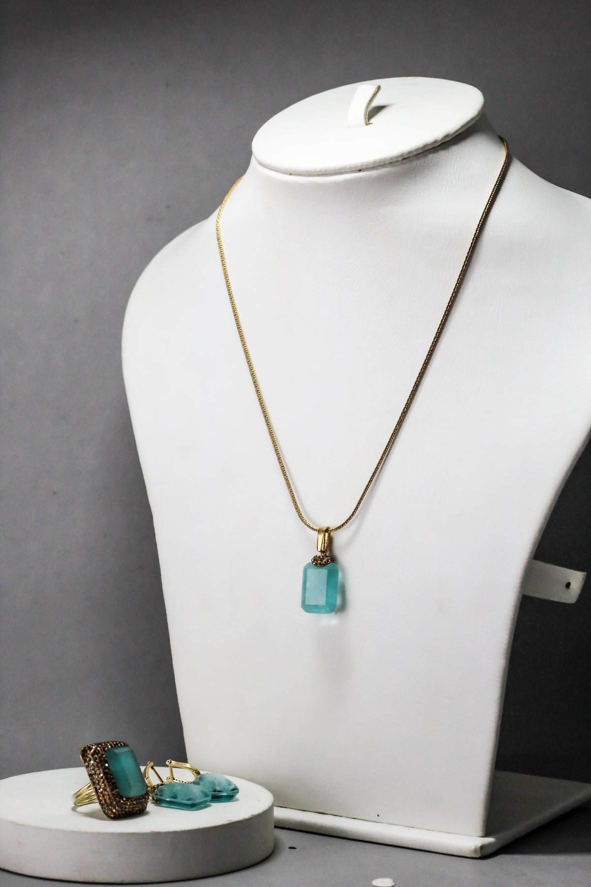 Matching necklace, ring, and earrings create a perfectly coordinated set.