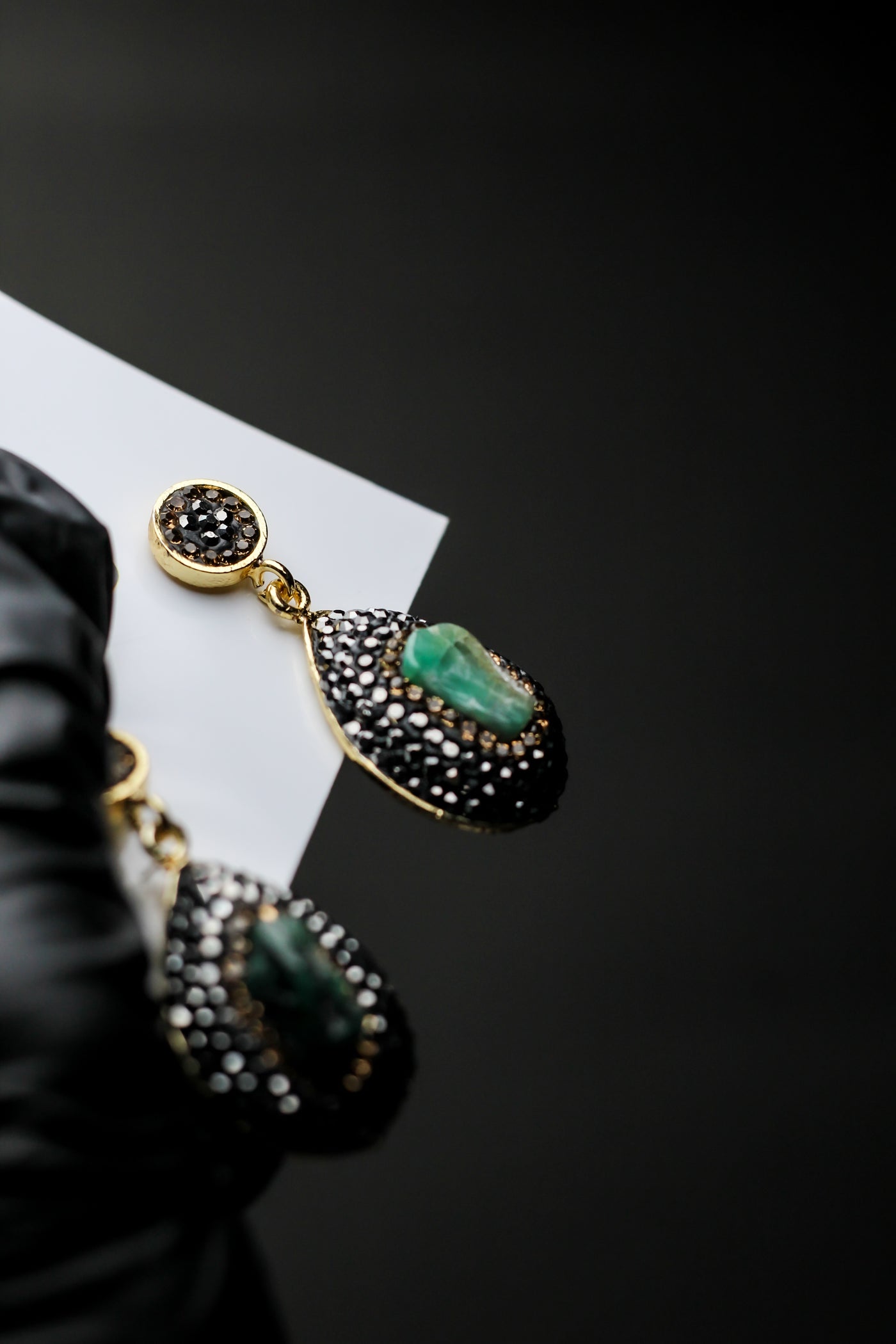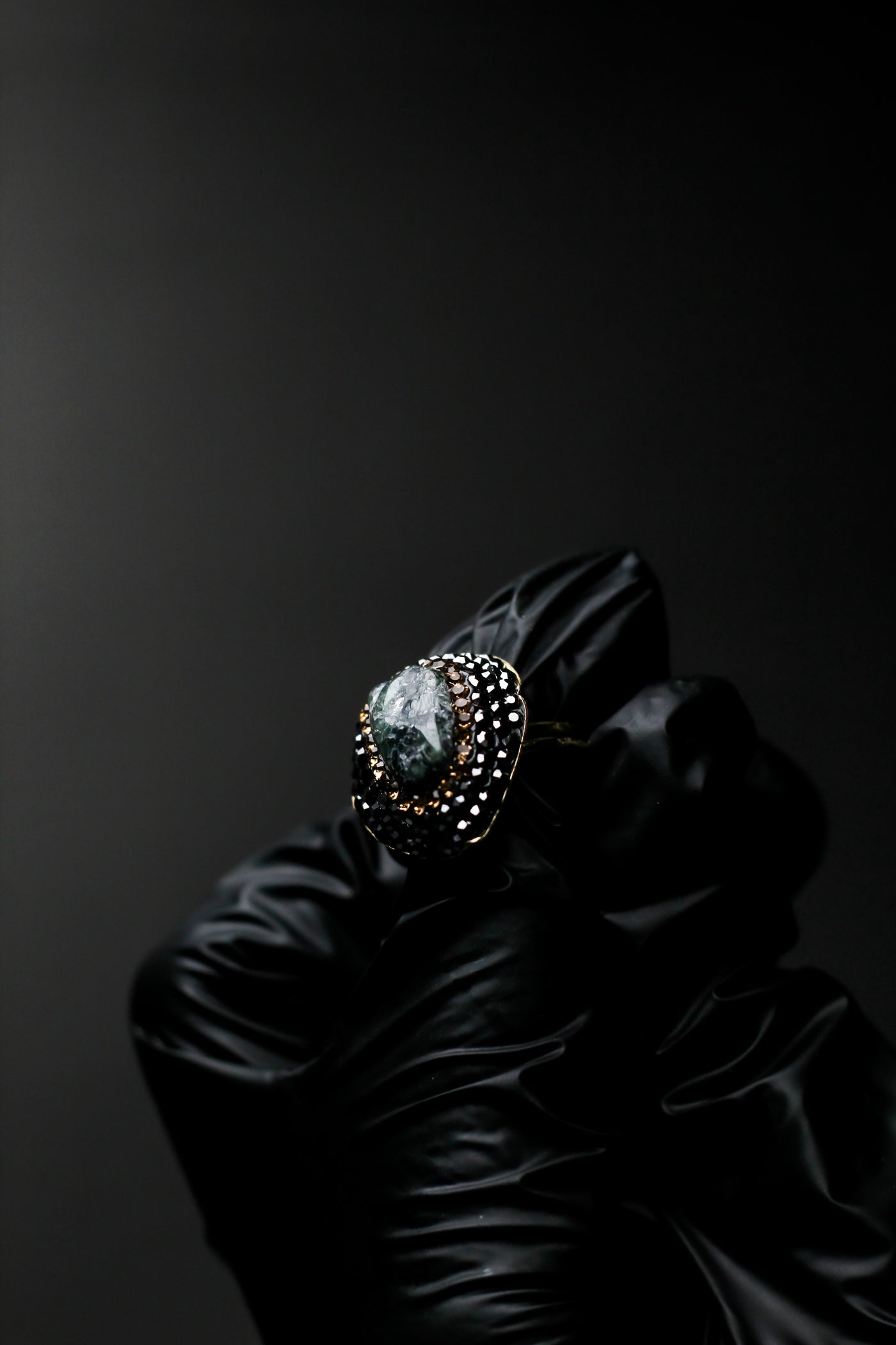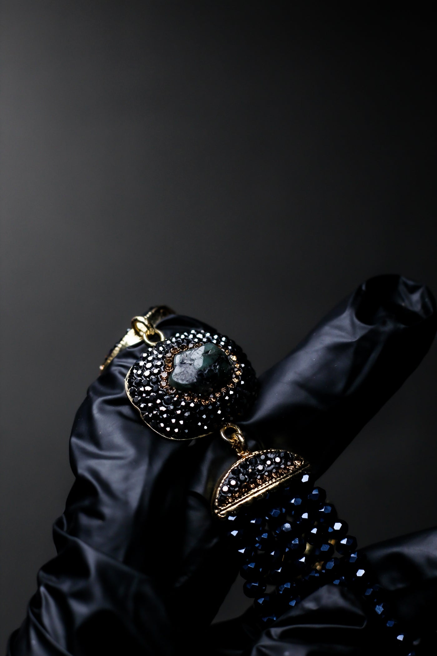 • Black Crystal Detailing – Hand-set crystals create a dramatic noir backdrop.