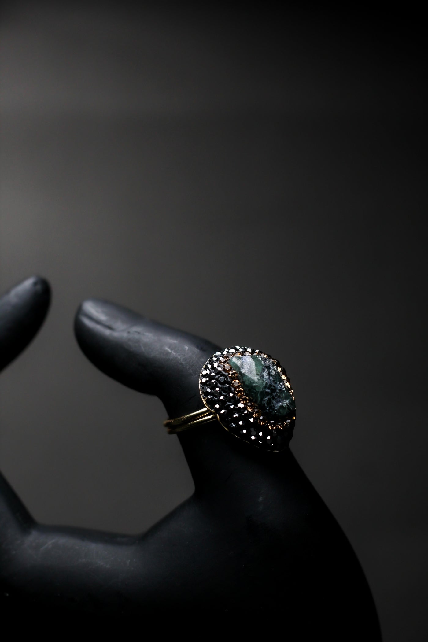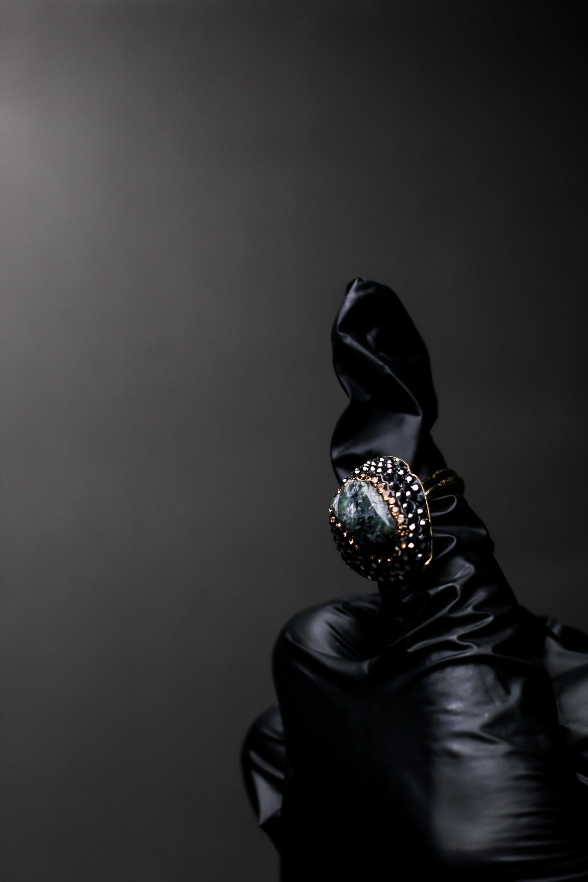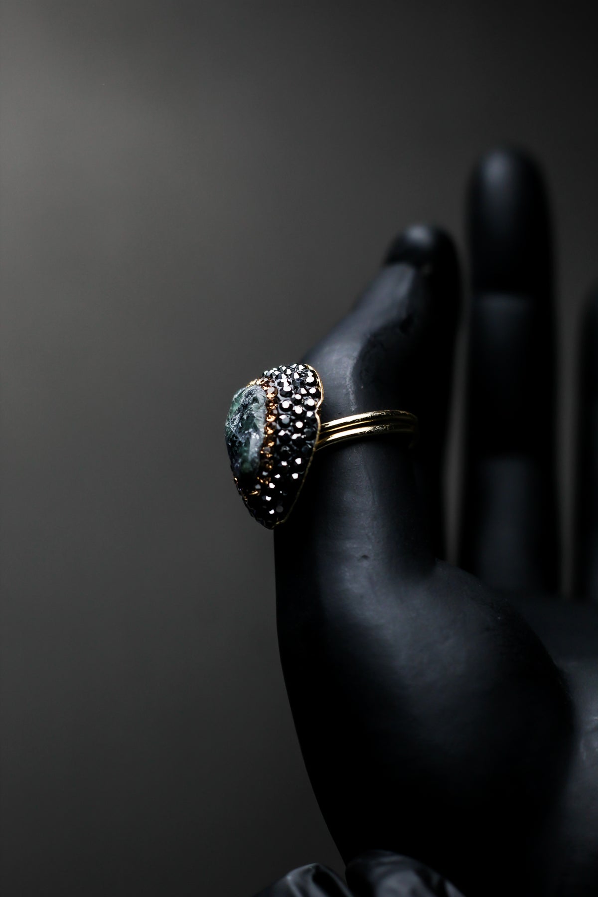 • Black Crystal Detailing – Hand-set crystals create a dramatic noir backdrop.