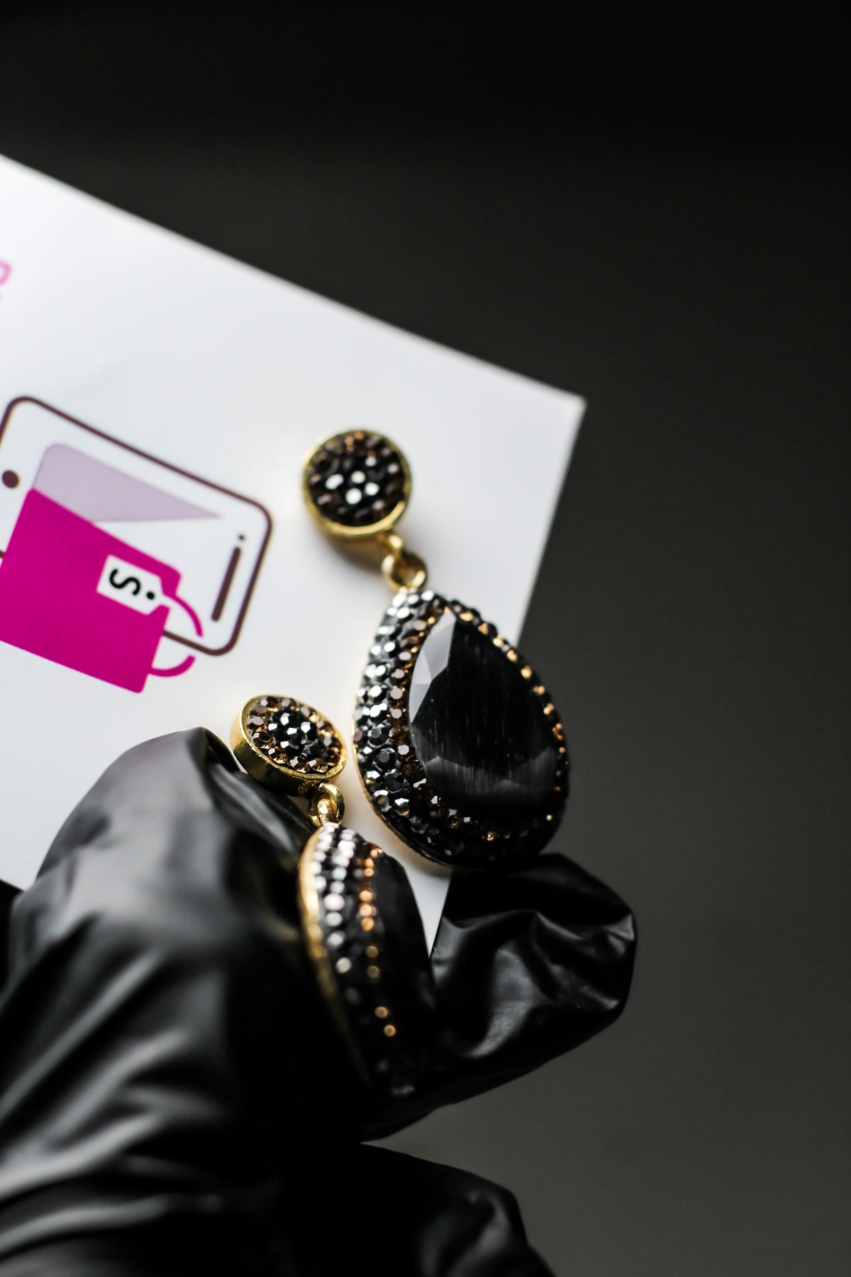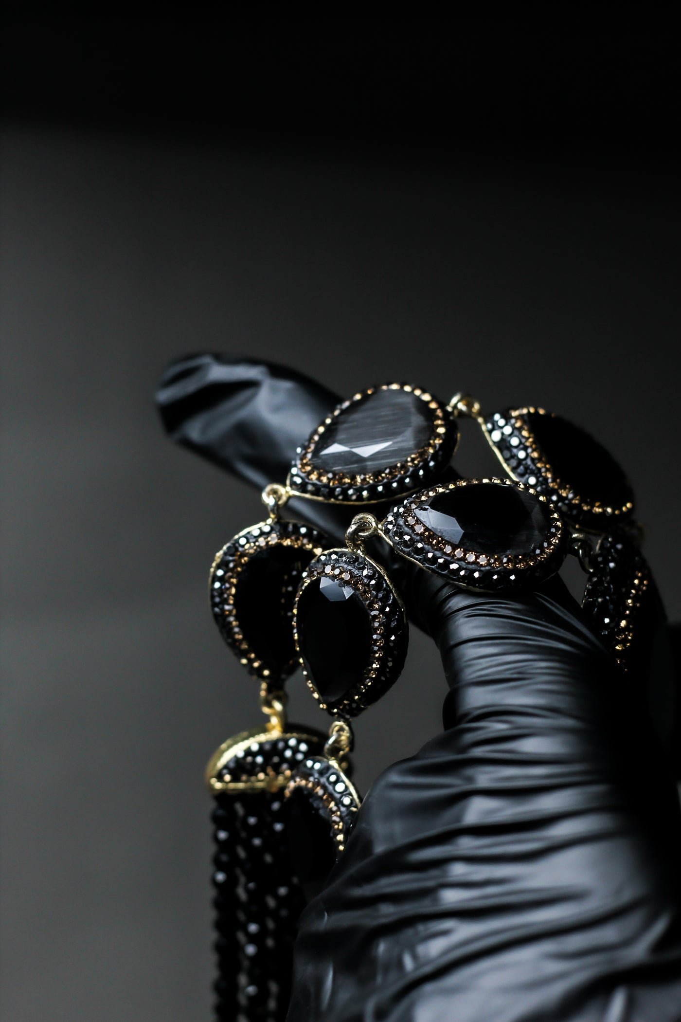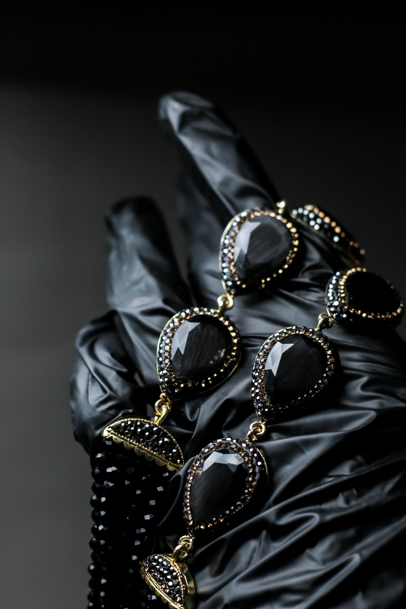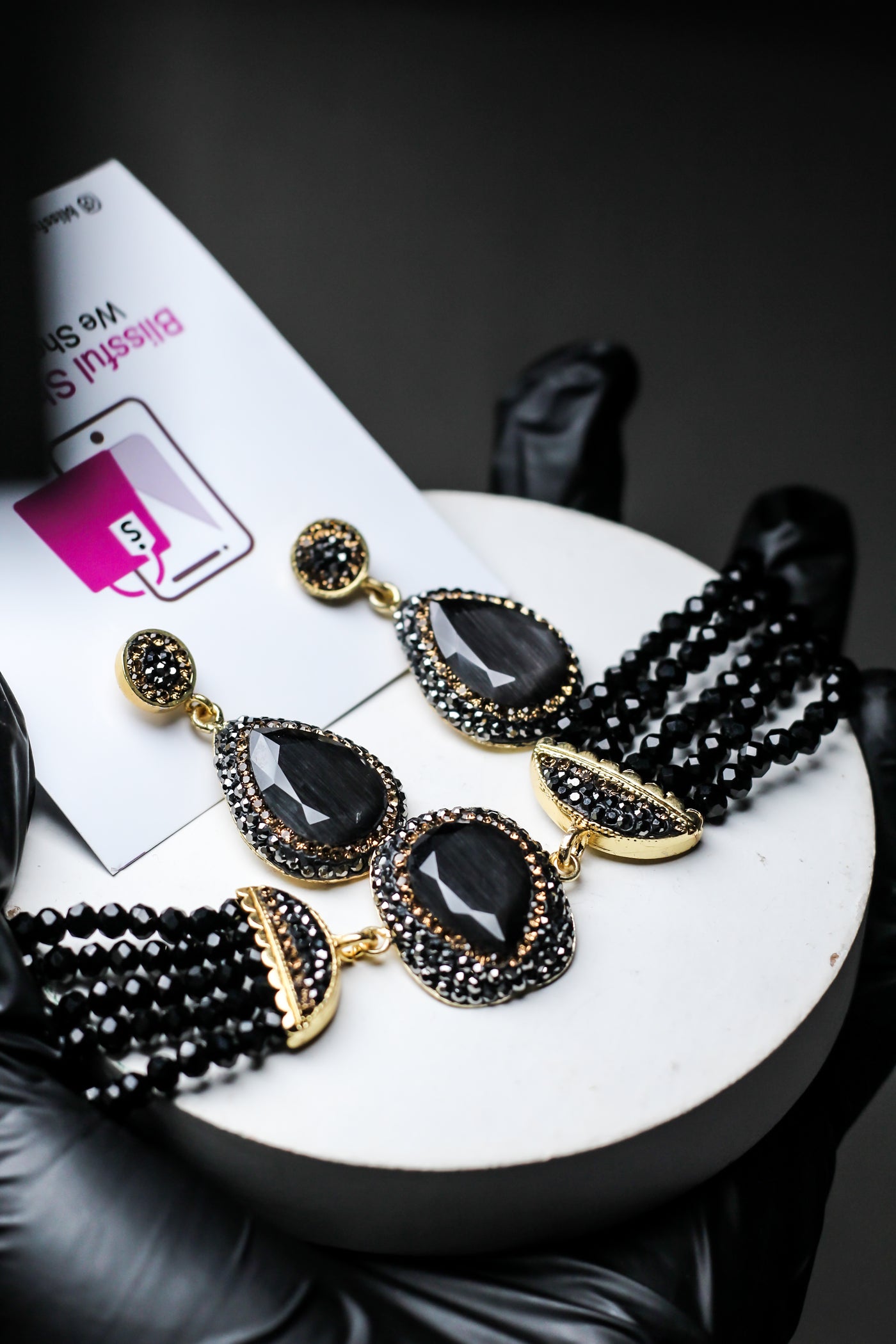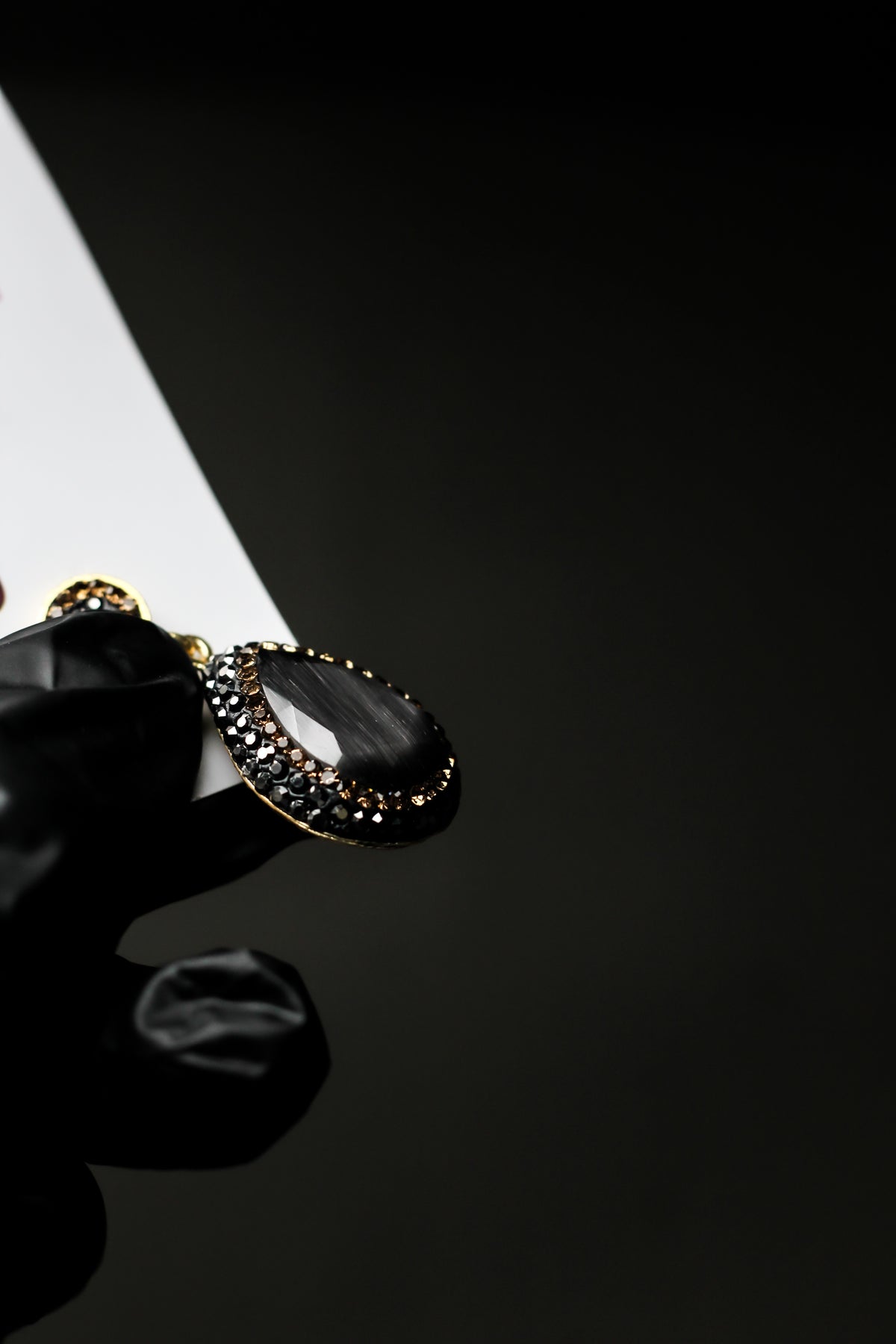• Faceted Teardrop Stones – Shimmering black stones framed with gold accents for a striking contrast.