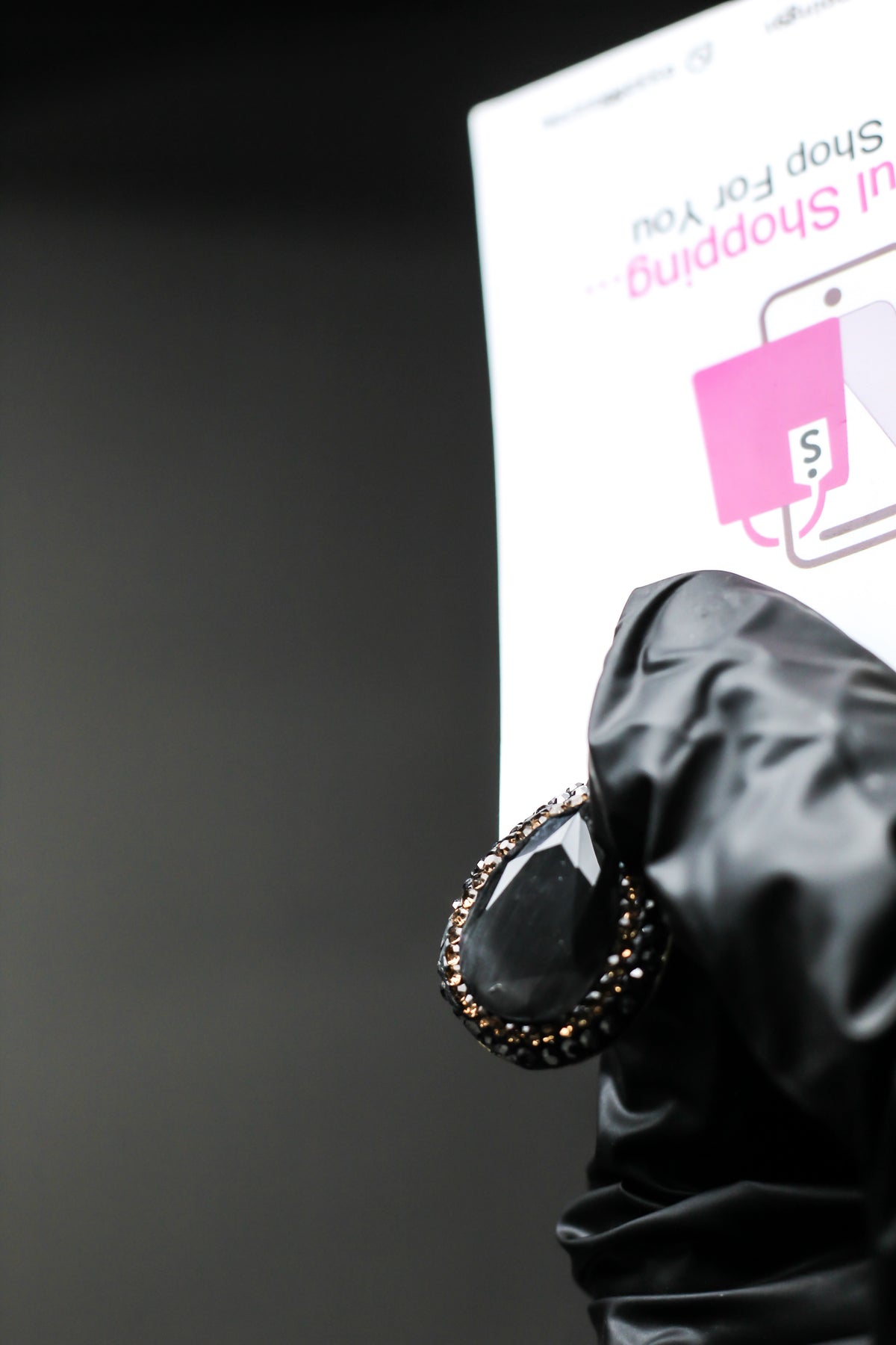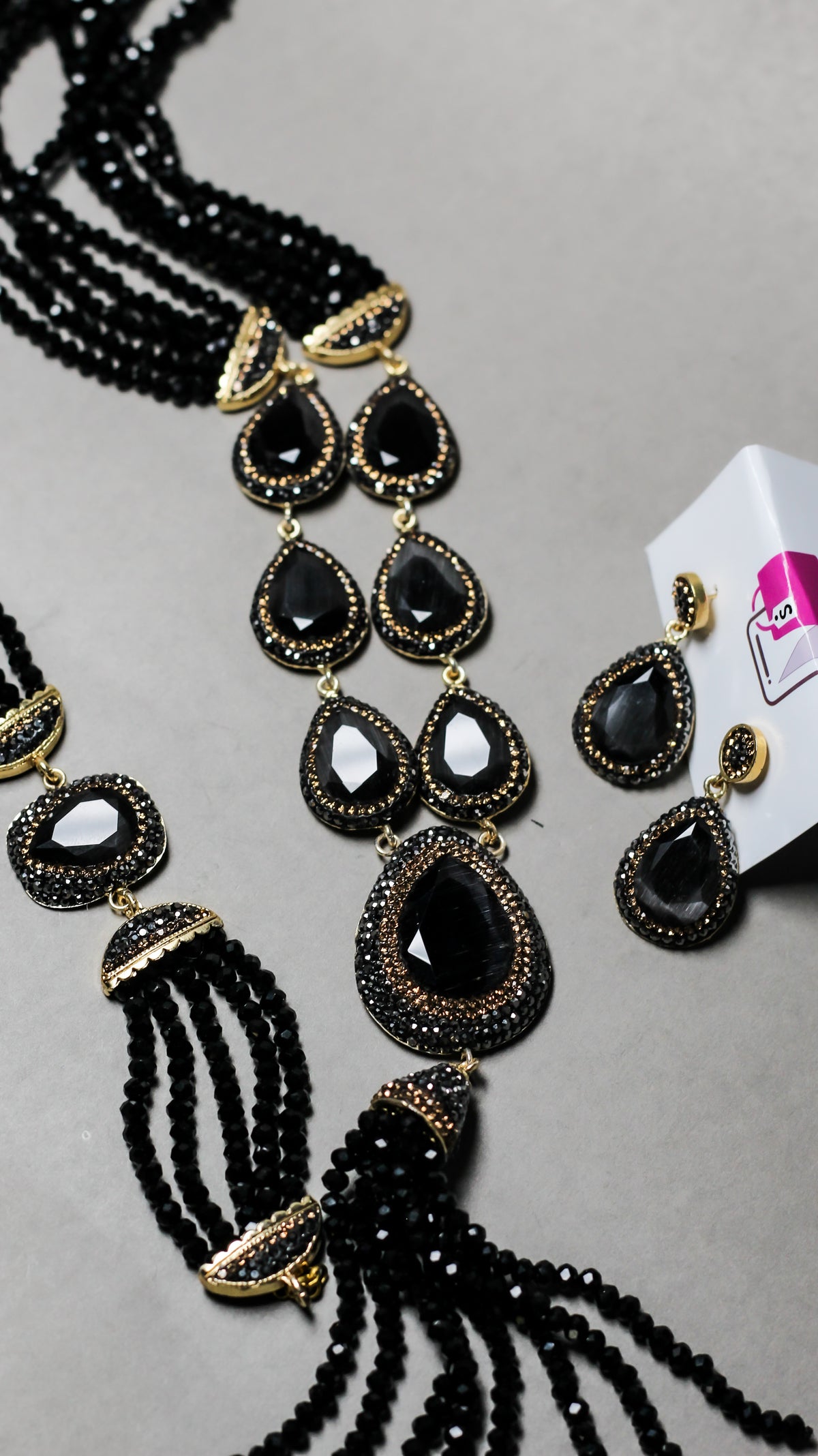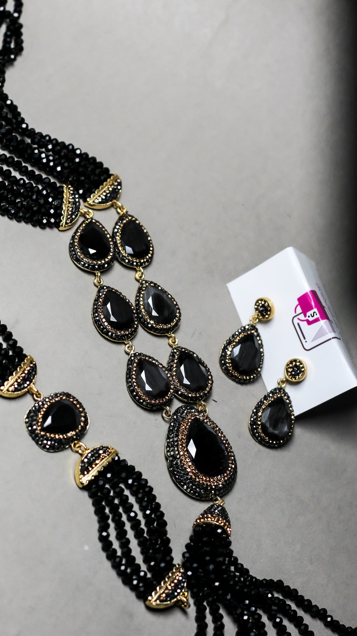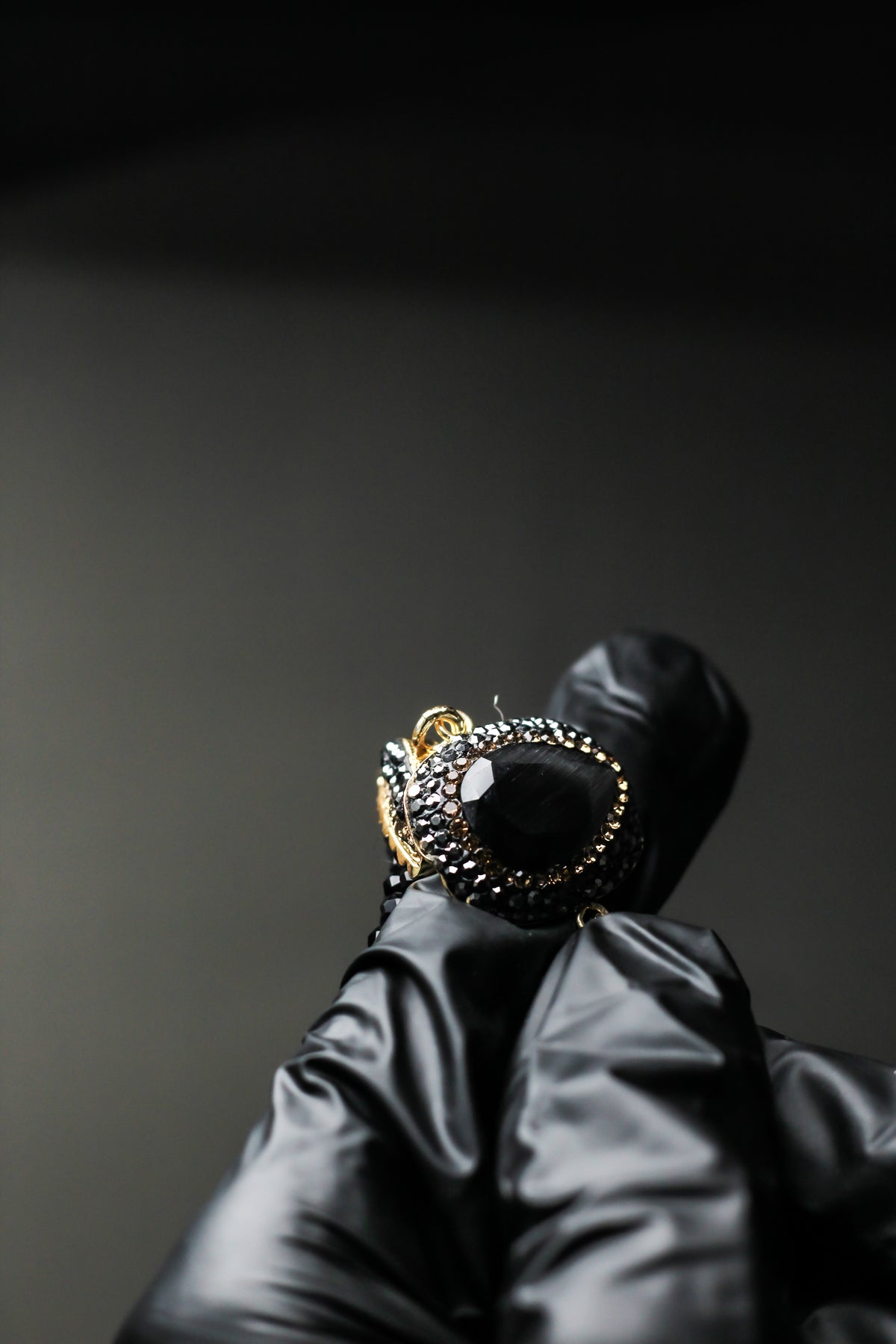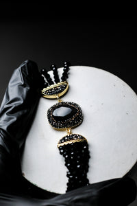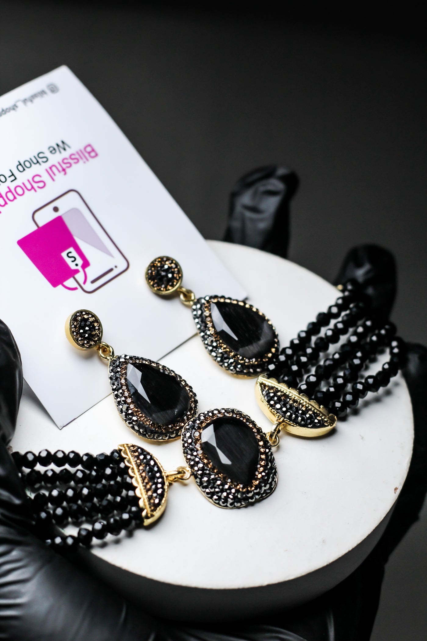 • Faceted Teardrop Stones – Shimmering black stones framed with gold accents for a striking contrast.
