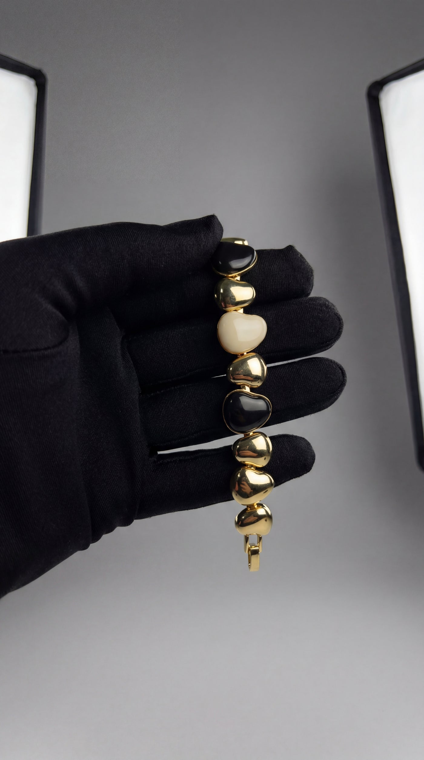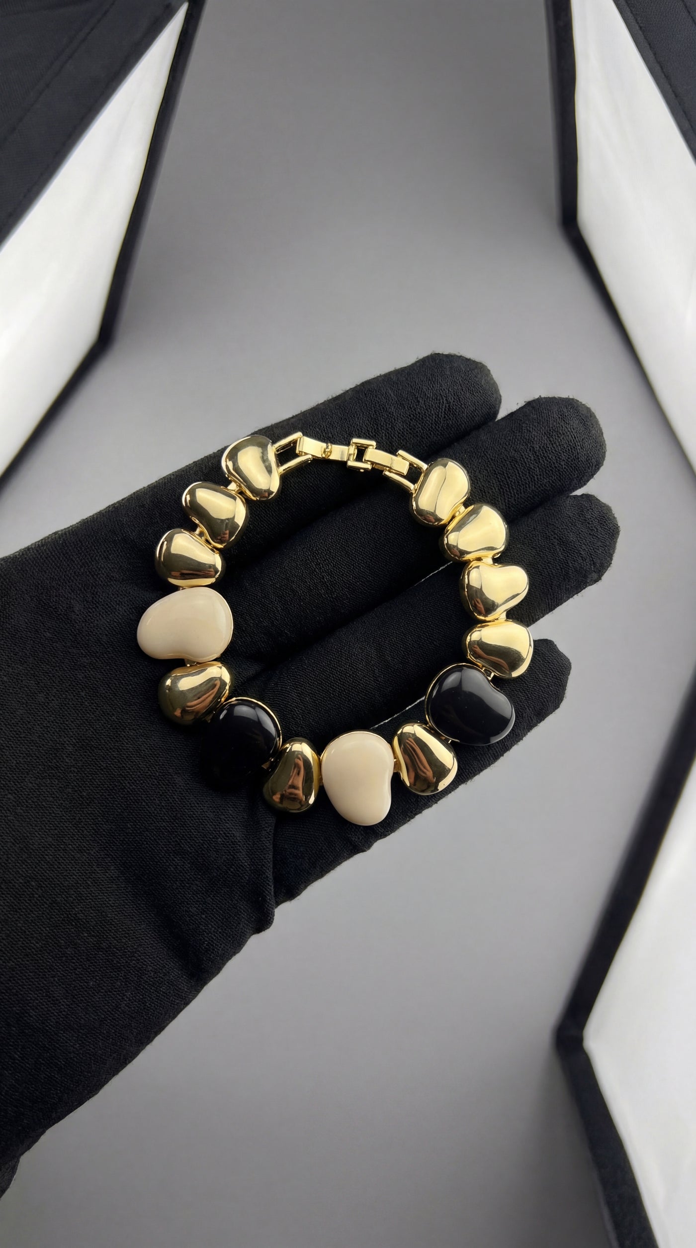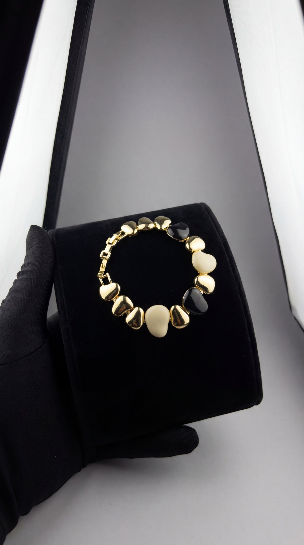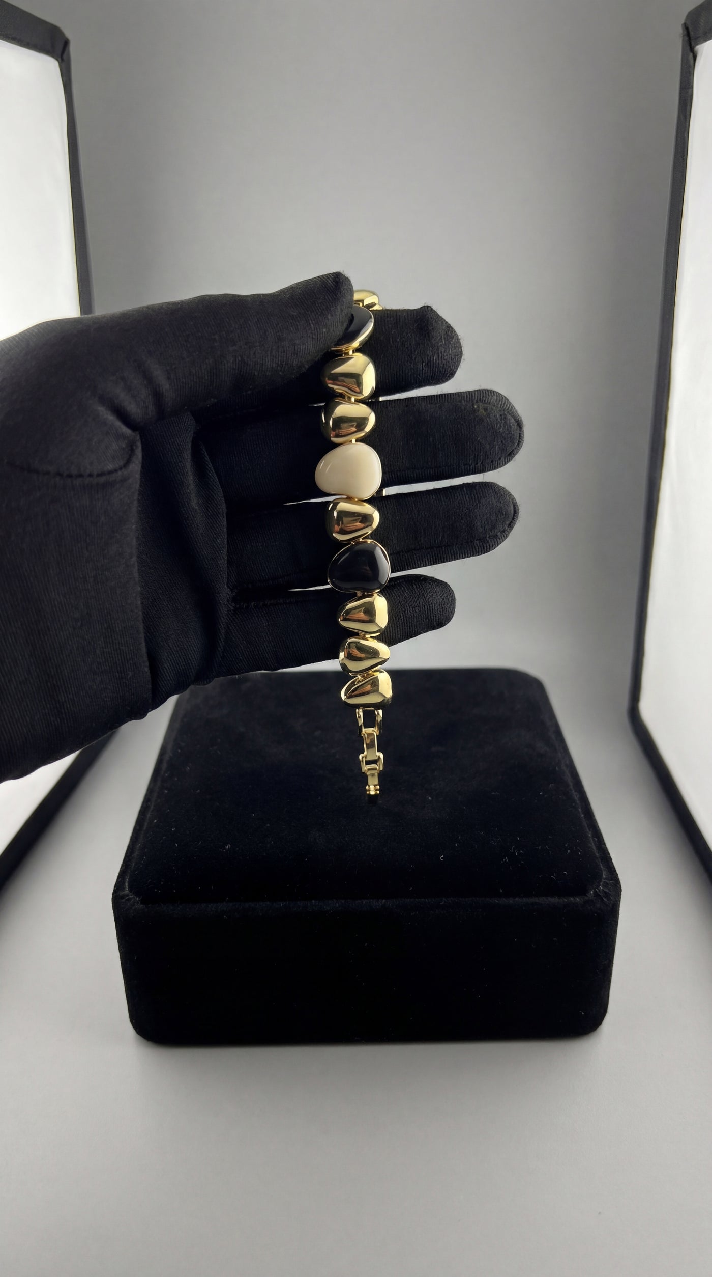 Bold Contrast Look – Black and pearl-tone stones for a high-impact luxury bracelet style.